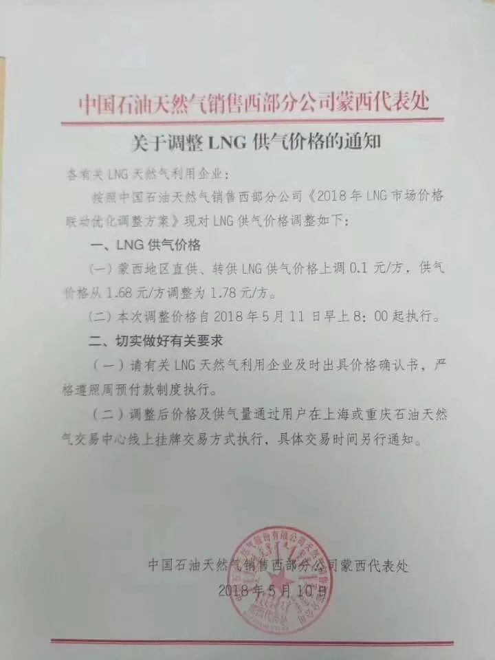 昨日中石油的一份调价通知刷爆朋友圈:蒙西地区直供、转供LNG供气价格上调0.1元/方,供气价格从1.68元/方调整为1.78元/方。